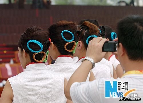 7月27日,北京奧運會奧運村開村儀式上的禮儀小姐帶上了五環樣式的發飾。當日,2008年北京奧運會奧運村正式開村,奧運村將接待來自200余個國家和地區的16000余名運動員和隨隊官員。