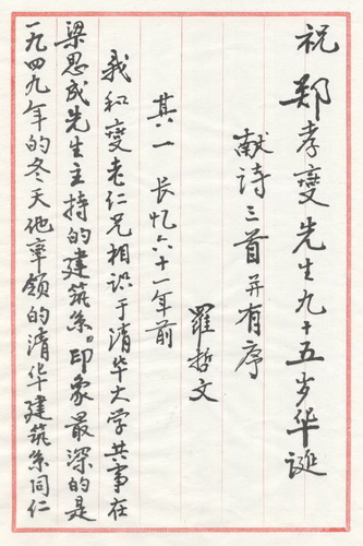 中國風景園林網訊 2010年3月17日(農歷二月初二)是我國著名古建筑保護專家鄭孝燮先生94周歲壽誕,我國著名古建筑專家羅哲文先生為鄭老題詞祝賀并著詩文。