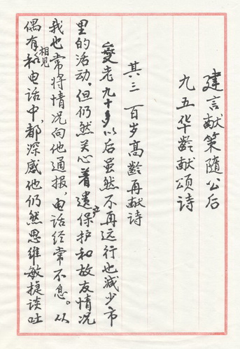 羅哲文先生是國家文物局古建筑專家組組長、中國文物學會會長、全國歷史文化名城保護專家委員會副主任、中國長城學會名譽會長,與鄭孝燮、單士元并稱我國古建筑保護界的“三駕馬車”。值此鄭孝燮先生94周歲壽誕之際,羅哲文先生題詞祝壽,并作詩三首回顧與鄭孝燮先生共事的數十春秋,并恭祝鄭孝燮先生身體健康! 羅哲文先生的賀文如下: 祝鄭孝燮先生九十五歲華誕 獻詩三首并有序 羅哲文 其一 長回憶六十一年前 我和燮老仁兄相識于清華大學,共事在梁思成先生主持的建筑系。印象最深的是一九四九年的冬天他率領的清華建筑系同仁和學生共同幫助大同煤礦恢復生產修建房屋,并參觀了大同的古建筑。中國營造學社梁思成先生等在抗戰前對大同古建筑、石窟曾做詳細的調查研究,寫了專門報告。思成先生十分關心,行前特別告訴我們順便去看一下。 長憶六十一年前 其二 三駕馬車記昔時 燮老仁兄六十多年來我們一直不懈為保護文物古跡、歷史文化名城、風景名勝而奔走,特別是在文革之后“撥亂反正”,在五、六、七、八屆全國政協和單士元三委員經常奔走,為保護遺產而驅馳,曾被稱為政協保護文物的“三駕馬車”。單老長鄭老八歲,鄭老又長我八歲,我是小弟弟。當年初入政協還不到六十,現在也向九十歲進軍了。匆匆三十年,彈指一揮間。單老已經駕鶴仙去,鄭老在向百歲進軍,而當年三駕馬車的情景似在眼前。 三駕馬車記昔時 其三 百歲高齡再獻詩 燮老九十多以后雖然不再遠行也減少市里的活動,但仍然關心著遺產保護和故友情況。我也常將情況向他通報,電話經常不息。從偶有相見和電話中,都深感他仍然思維敏捷,談吐響亮流暢。昨日專門登門看望時,情景依舊似當年,不勝之喜。此乃政通人和、國泰民安時代之所賜也。 九五華齡身壯健 二〇一〇年三月十二日 羅哲文并書