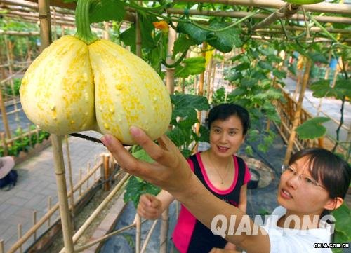 今天,北京世界花卉大觀園里,園藝師在給游客講解剛剛發現的連體并蒂珠瓜。當日,北京世界花卉大觀園的園藝師在修剪枝蔓時,發現了這株并蒂連體珠瓜。 這兩個珠瓜整體呈現淡黃色,表面有很多珠子一樣的凸起,“腹部”緊緊相連。據世界花卉大觀園園藝師魏文華介紹,珠瓜是觀賞南瓜的一個品種,但像這種并蒂連體珠瓜的情況,非常少見,這株并蒂連體珠瓜估計是在20天前剛剛長成,目前已基本成形。 花卉大觀園已經研究決定,待此連體并蒂珠瓜成熟后,摘下珍藏,取籽明年再種,看它是否還會結出連體珠瓜。