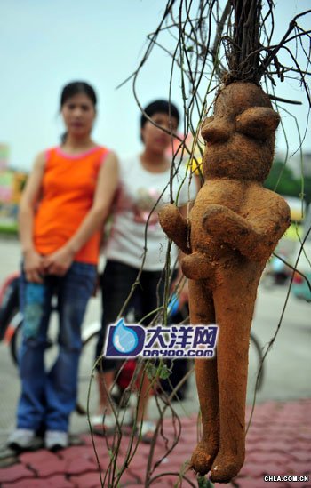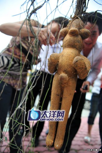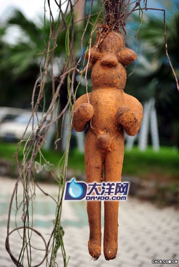 幾個路人圍著看稀奇人形植物 有人說是萬年人參,有人說是千年何首烏,有人說是變形的地瓜,還有人說是樹精,“一定能賣個大價錢”。 “眼睛、鼻子、手臂、大腿一個不缺,各部位惟妙惟肖,實在是太像小人了!”昨日,家住番禺的市民譚先生從附近工人手中購得一株奇怪的植物,活似一個縮小版的成年男人的形狀,細看又像是一個“外星人”,讓人拍手叫絕。 奇怪的植物根真像一個男子人形 6月16日下午,記者在番禺鐘村附近見到了譚先生和他手上的“寶貝”。這株奇怪的植物人形部分主要是其根部。只見它略顯胖的“臉蛋”上分布著一雙突出的大“眼”、一只大“鼻子”,短小的“軀干”上同樣長著互相對稱的雙“臂”、雙“腿”,背部和臀部輪廓很清晰,而它“頭”頂上長達數米的藤枝,又好似人的長發。最讓人稱奇的是,其修長的雙腿間赫然長著“男性生殖器”,而且各部位比例也都像一個男子的形狀。 這株奇怪的植物根部長度約40~50厘米,呈土黃色,還粘有一些黃泥,細看根部表面分布著細小的“須根”;而藤枝有兩米多長,部分枝葉開始干枯,拿在手中掂量,少說也有2公斤重,干枯枝葉旁還有一塊發育不完全的短根,形似該“男子”的小辮,黃泥遍身又使得這“小人兒”好似一個陶器。 據譚先生介紹,這株奇怪的植物是從附近工地一名工人手中買來的。昨日上午,譚先生正在小羅村附近公路邊和朋友聊天,這時突然看到一名工人手里拎著這株植物向他們走來。“我們覺得挺新奇,馬上走了上去,仔細一看,真的好像一個人形。”見此植物非常奇特,譚先生覺得可能有收藏價值,便和朋友商量,最終花了500元從這名工人手里買下了這株植物。 買主:會把它帶回家澆水栽培 譚先生告訴記者,那名工人對他說,這棵奇怪植物是工人們從小羅村附近一座矮山山坡工地上挖出來的,大家覺得十分稀奇,就把它工地上轉移下來。 譚先生的“寶貝”一亮相,立即引來大批過路市民圍觀。這株神秘的植物到底是什么呢?圍觀的路人有的說是萬年人參,有的說是千年何首烏,有的說是變形的番薯,還有人說是樹精,很有靈性要奉為圣物,“一定能賣個大價錢”。 路人陳先生熟悉園藝栽培,他認為,這株植物可能是一只人工培育的人形何首烏,即是將何首烏栽到人形模具內,再加上營養土培育,只要一年的時間就能將其培養得很大,于是有些人故意將其吹噓成是千年何首烏,并以高價出售。“之前就聽說有人上過當,高價買回這玩意兒,結果卻是一錢不值。”對此,他希望譚先生能找到有關專家前去鑒定。 譚先生表示,自己只是覺得這株植物很新奇,不管值不值錢,他都會把這株植物帶回家澆水栽培。