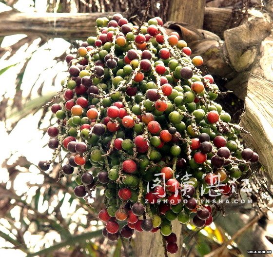 樹上一面掛著有如一串串玉珠一樣的花蕾 魚尾葵屬熱帶、亞熱帶植物,喜熱怕冷,雖然受年初冷雨天氣侵害,不少魚尾葵變得枝殘葉敗,但都依然挺拔,并且花盛果碩。樹上一面掛著有如一串串玉珠一樣的花蕾,上面開著黃色整齊的小花,另一面又結滿如珠似玉、有如指尖大小的果實。這些果實有紅有綠,圓潤剔透,紅似寶石,綠似翡翠,珠圓玉潤,惹人憐愛。