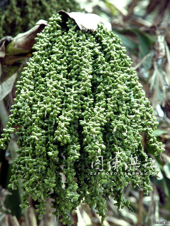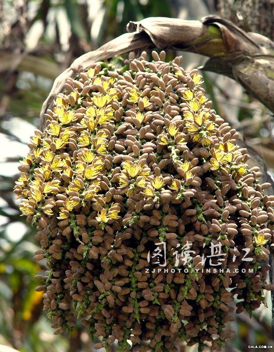 上面開著黃色整齊的小花 魚尾葵是常見的庭園綠化樹,也許是因為它的葉端形似魚的尾巴才有此名的吧。它葉色墨綠,果細花不香,不易引人注目。但它經霜不敗,果實累累,又讓人刮目相看。