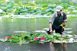 圖為工人正在為睡蓮清除發黃變色的