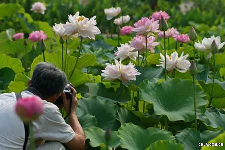 競相開放的荷花吸引攝影愛好者拍照。當(dāng)日,武漢東湖荷花節(jié)在東湖磨山景區(qū)揭幕。磨山荷園是中國荷花研究中心所在地,面積100多畝,缸栽荷花近萬缸,植有荷花570余種,占全球荷花品種的80%以上。
