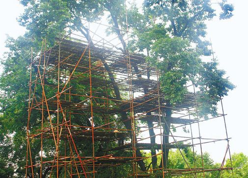 編號為653的大樹旁邊,搭起了一個大約五層樓高的腳手架,寬三四米。抬頭看得見的樹干光禿禿一片,往上到10米的地方,有一道手臂粗的裂縫。地上隨處可見大樹身上掉下來的枝葉。 一位在底下搬運鋼管的工人說,這棵樹高四五十米。他們一個星期前就開始搭腳手架了,因為下暴雨,陸續停工了幾次。估計明天能把整個腳手架搭完。