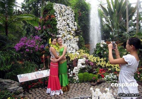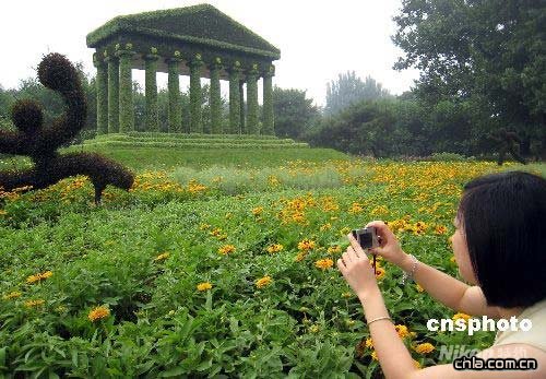 7月8日,世界花卉展在北京植物園開幕。作為奧運文化活動之一,花展以“五環連五洲世界花卉展”為主題,在6萬平方米的展區內,展出1000余品種100萬余株植物,以及205個國家和地區的國花、國樹、區花、區樹,五大洲最具代表性的植物與花卉紛紛亮相,令中外游客大飽眼福。圖為用綠色植物設計成的雅典神廟和運動員造型吸引游客拍照留念。