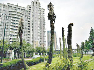 記者昨天在番禺麗江花園的明風道、雪沙道、金棕道等處看到,除極少幾棵海南椰樹的頂端還零星存留幾片青黃參半的“綠色葉片”外,絕大多數的海南椰樹都已經枯死禿頂了,只剩下孤零零的枝干還立在那里。