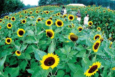 近日,在世紀公園靠近蒙特利爾園荷花池旁,正盛開著近3萬株金燦燦的向日葵,最高的有2米,低的到腰間,這是公園特地從美國引進的觀賞品種,也是首次在上海公園里展出。細枝干托著一顆顆大腦袋,有的是黑心,有的是綠心,被金黃的花瓣緊緊包圍,好似一張大嘴,在快樂地歌唱。這片向日葵一直可觀賞到本月底。