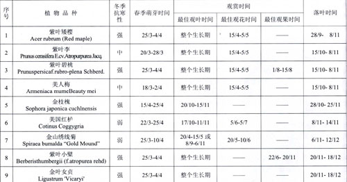 彩葉植物是指整個生長季節葉片保持非綠色的植物。隨著人類文明的不斷進步,人類對環境的要求越來越高,提高人居環境不僅僅要求綠地面積到一個很高的標準,更主要的是城市園林景觀的觀賞性、長效性以及對人類的宜居效果。城市綠化景觀強調喬、灌、花、草的有機結合,講求樹種季相、林相、色相的多重效果。然而由于氣候的原因,北方植物材料相對缺乏,品種單一,觀賞期較短,因此彩葉植物以其色彩艷麗,觀賞期長,營造的園林景觀穩定性強,色相變化明顯等無可比擬的優越性在園林行業中占有相當大的優勢。 筆者主要選取了紫葉矮櫻、紫葉李、紫葉碧桃、美人梅、金枝槐、美國紅櫨、紫葉小檗、金葉女貞等較為常見的植物品種(詳見附圖)從以下幾個方面進行評價: