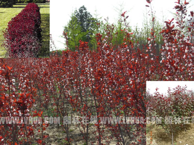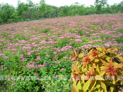 景觀評價:為黃櫨的變種類型,其葉色一年三季之中富于變化,初春時葉片為鮮艷的紅色,春夏之交葉色更為紅而麗,盛夏時樹體下部葉片開始漸漸轉為綠色,但頂梢新生葉始終為深紅色,入秋后葉色又變為深紅色,遇秋霜則葉色更加美麗。美國紅櫨夏季開花,于枝條頂端花序絮狀鮮紅,觀之如煙如霧,甚為壯觀(詳見附圖)。此種適合片植,呈一定規模才能顯示出其壯觀的景觀特點。 適應性評價:美國紅櫨對土壤要求不嚴,且生長旺盛。但是其抗寒性較差在北方地區秋季或初冬栽植需先假植越冬,但是冬季有抽條枯枝現象。 7、金山繡線菊: