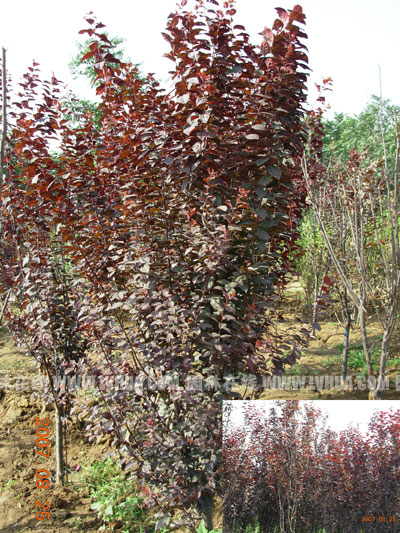 景觀評價:紫葉矮櫻春季新生葉就表現為紫色,到秋天則葉片變為深紫色,其色彩鮮艷,觀賞期長,整個生長期內均為鮮艷的紫紅色(詳見附圖),每年的4-5月份開花,花白色5瓣,微香,春季觀花增強了此種材料的季相變化;由于此種材料耐修剪,易于造型,分枝能力較強,增加了其作為應用的廣泛性。 適應性評價:紫葉矮櫻對土壤的要求不嚴,并且有耐干旱,病蟲害較少的特點,在北方栽植沒有抽條枯枝的現象。 2、紫葉李: