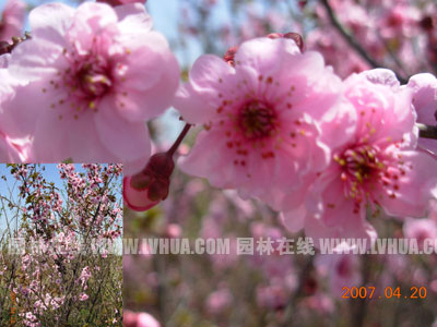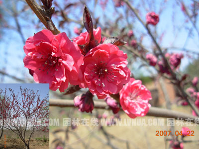 景觀評價:紫葉碧桃由于山桃花的地方就是,花重瓣、花形大、花色艷麗、花期四月中旬到五月初,花葉同時展開,新生葉紅紫色,俏麗枝頭,(詳見附圖)果實6-9月成熟。紫葉碧桃在整個生長期內景觀富于變化。紫葉碧桃樹冠較大,樹形豐滿,可孤立栽植于草坪、庭院中。 適應性評價:紫葉碧桃較耐寒、耐旱,忌水澇。不需要任何防寒措施可在北方安全越冬,無抽條和枯枝現象。 4、美人梅:
