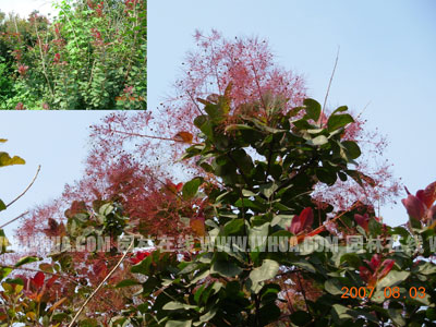 景觀評價:金枝槐的枝和葉在春秋兩季呈金黃色,夏季則轉變為淺黃色,冬季金黃色的枝條獨成一景。在景觀配置上即可作主要樹種又可作混交樹種,適用于孤植、叢植、群植等各種方式的種植效果,是不可多得的彩葉植物之一。 適應性評價:該品種繼承了國槐作為北方鄉土樹種的很多特性,具有較強的抗旱能力和抗寒性,病蟲害較少,管理成本低。 6、美國紅櫨: