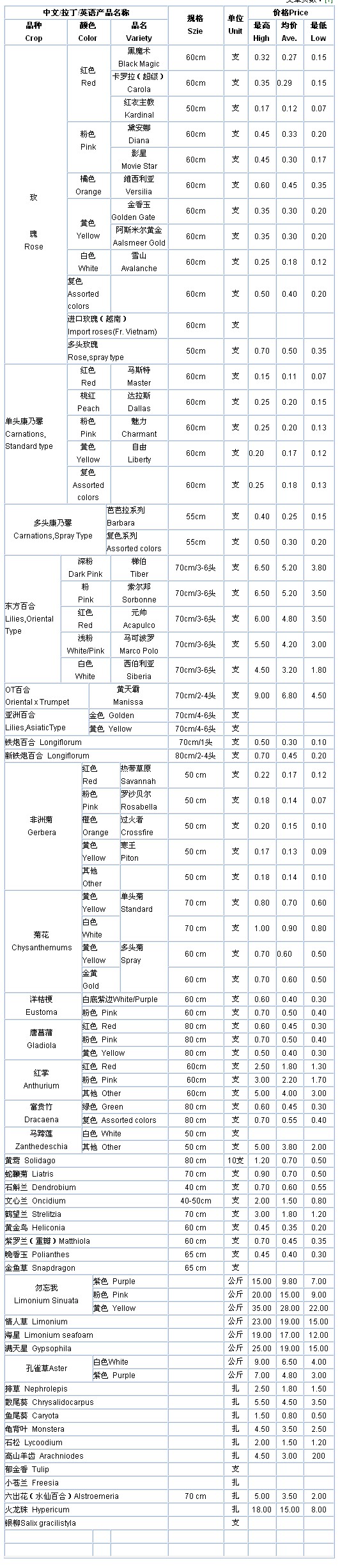 云南斗南花卉信息中心2009年07月27日鮮切花報價