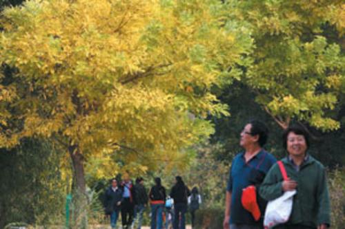 圖為園內(nèi)金枝國槐的樹葉已被染成金黃色 植物園內(nèi) 隨處見秋色———