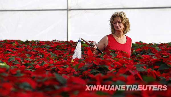 11月17日,一名工人在加拿大萊維的一個溫室為一品紅澆水。一品紅原產于墨西哥和中美洲,因其頂層的葉片在圣誕節左右會變成火紅色,故又名圣誕花,是在圣誕節用來擺設的著名花卉。新華社/路透