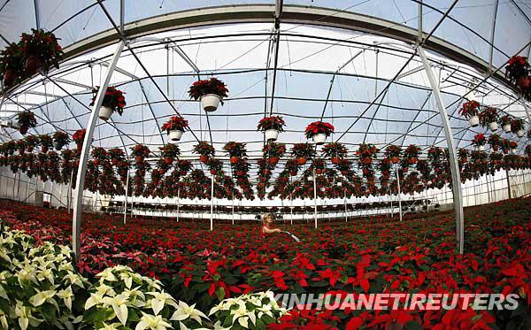 這是2009年11月17日在加拿大萊維拍攝的一個種植一品紅的溫室。一品紅原產于墨西哥和中美洲,因其頂層的葉片在圣誕節左右會變成火紅色,故又名圣誕花,是在圣誕節用來擺設的著名花卉。新華社/路透