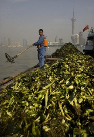 綠!到處是綿延的綠!從11月23日開始,黃浦江景觀水域滿目都是隨波漂蕩的綠色水葫蘆,或呈帶狀,或堆積成毯,綿延黃浦江中下游水域約20公里,看得游客觸目驚心。 對(duì)此,市綠化和市容局水上環(huán)境管理處表示,目前,水葫蘆爆發(fā)的速度已經(jīng)超過(guò)作業(yè)部門的打撈能力,因此黃浦江上游已告“失守”,漏網(wǎng)的水葫蘆順流而下,漂至外灘。這也是“綠魔”今年首次侵入申城景觀水域。