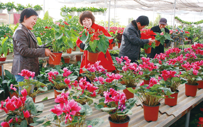 圖為近日,山西省陽城縣岳莊村農民在大棚整理準備出售的花卉。