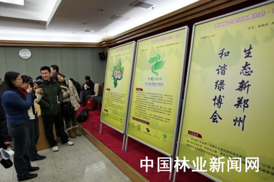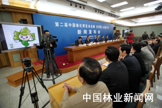 新聞發布會上揭曉的第二屆中國綠化博覽會會徽、吉祥物和主題口號。 |