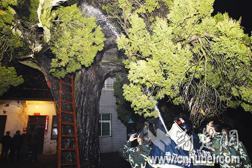 18日下午,黃陂區橫店街百花村彭郁灣出現奇特的一幕:一棵有著800年樹齡的刺柏突然自燃,消防官兵用了10余噸水才將火撲滅。 18日晚8時許,記者在現場看到,消防官兵正圍著這棵5米高的古樹澆水,樹枝間還不斷有濃煙冒出,樹干上已經露出一個大洞。樹干上的標牌顯示:這棵樹已存活800年,2006年被列為武漢市古樹名木。 村民胡婆婆說,18日下午4時許,她突然看見這棵古樹冒出一陣青煙,等村民們提著水趕來滅火時,樹干已冒出了火苗。 消防官兵聞訊趕到,滿滿一消防車的水澆完后,樹干上依然還有青煙冒出,又組織來兩輛消防車滅火,至昨晚9時,官兵們還在往樹洞內灌水。 橫店街林管站站長羅建華告訴記者,這棵刺柏樹的樹干已被蛀空,里面的雜物日積月累出現碳化,很容易自燃,他們將組織人員進行看護。