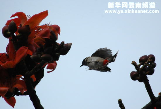 近日來,云南勐臘縣境內的棉樹紛紛綻放花朵,吸引了鳥兒前來享受“花蜜大餐”。新華社發(李云生 攝)