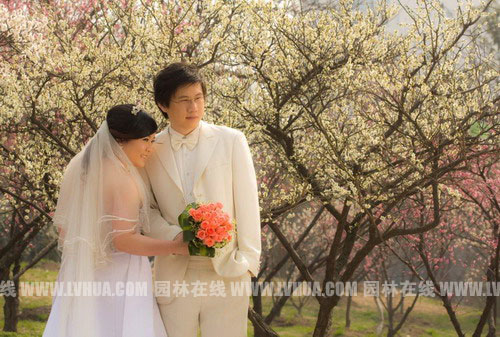 甜蜜愛侶,在梅花園內拍婚紗照,梅花美化了背景,他們美化了梅花園