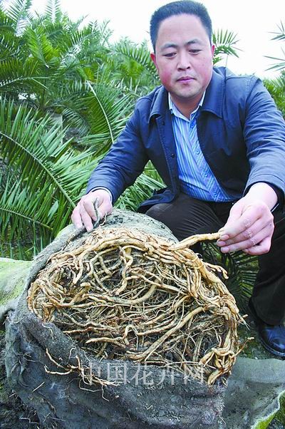 圖為張維先現場撕開美植袋,露出大量健康的加拿利海棗根系。