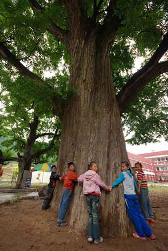 唐代大詩人李白入蜀時,曾經過青泥嶺(今陜西省略陽縣白水江鎮青泥嶺),極盡筆墨描繪了青泥古道的艱險,留下了千古巨作 《蜀道難》。 近日,在陜西省略陽縣白水江鎮青泥河九年制學校發現兩株千年銀杏樹王。兩株古樹相傳為大詩人李白入蜀時手植,距今已有1300多年。 兩棵樹雌雄相對而生,雄樹高28米,莖圍7.8米,樹冠覆蓋283平方米,需9名4年級的小學生手拉手才能圍。慌c之相鄰的雌樹高20米,莖圍2.9米,樹冠覆蓋154平方米。 據稱,古樹所在地從古到今都是當地學校書館所在,千年來一直守護這在此求學的學子。
