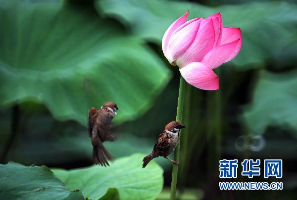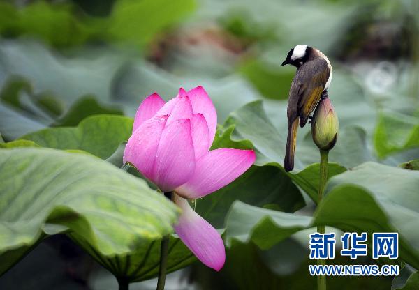 臺(tái)北植物園里盛開的荷花引得小鳥“流連”。