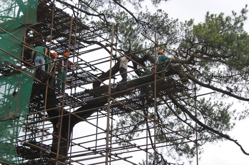 ![]() “受白蟻侵害,太鶴山上的一株百年古松松枝多處‘受傷’。”7月26日下午,縣園林管理處的工作人員趕到現(xiàn)場(chǎng),一邊搭建竹伐,一邊沿竹伐爬上30多米高的古松上,為古松修剪已經(jīng)遭病蟲害或者腐爛的枝葉。