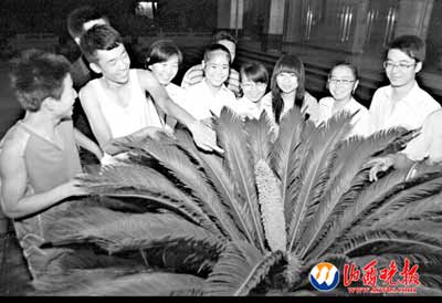 記者在信息學(xué)院院內(nèi)見到了這株開花鐵樹。這株鐵樹莖高60多厘米,直徑有40多厘米,覆蓋范圍達(dá)1.8米,巨大的綠葉層層相疊,在葉子中間一朵深黃色的花朵蓬勃而起,像一個巨大的“玉米棒子”。陣陣花香從一片片黃色花瓣內(nèi)散發(fā)出來,花朵在綠葉的掩映下,分外漂亮。 鐵樹學(xué)名蘇鐵,是地球上現(xiàn)存最原始的種子植物之一。受溫度影響其生長緩慢,一般要種十幾年才會開花,花期通常可持續(xù)1個月以上,在我國北方開花比較罕見。