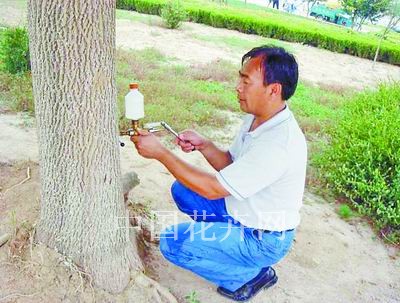 日前,勝利油田河口社區發現白蠟樹上有蛀干害蟲小線角木蠹蛾幼蟲危害的現象,于是技術人員采用高壓注入法,用注干機給樹干直接壓入100倍的80%敵敵畏乳油,利用樹干自身的動力把藥液帶到蟲害危害部位,然后用泥巴進行封堵。由于發現較早,措施得力,防治取得了良好的效果。