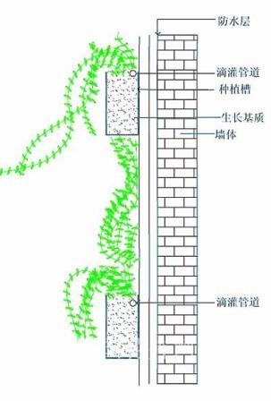 三、攀爬或垂吊式 即在墻面種植攀爬或垂吊的藤本植物,如種植爬山虎、絡石、常春藤、扶芳藤、綠蘿等(圖3)。這類綠化形式簡便易行、造價較低、透光透氣性好。