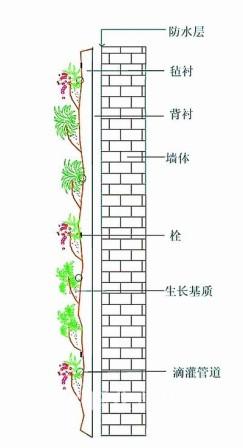 五、布袋式 即在鋪貼式墻面綠化系統基礎上發展起來的一種工藝系統(圖5)。這一工藝是首先在做好防水處理的墻面上直接鋪設軟性植物生長載體,比如毛氈、椰絲纖維、無紡布等,然后在這些載體上縫制裝填有植物生長及基材的布袋,最后在布袋內種植植物實現墻面綠化。