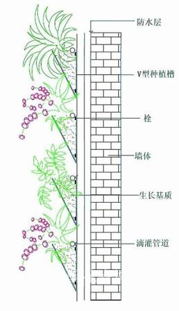 六、板槽式 即在墻面上按一定的距離安裝V型板槽,在板槽內填裝輕質的種植基質,再在基質上種植各種植物。