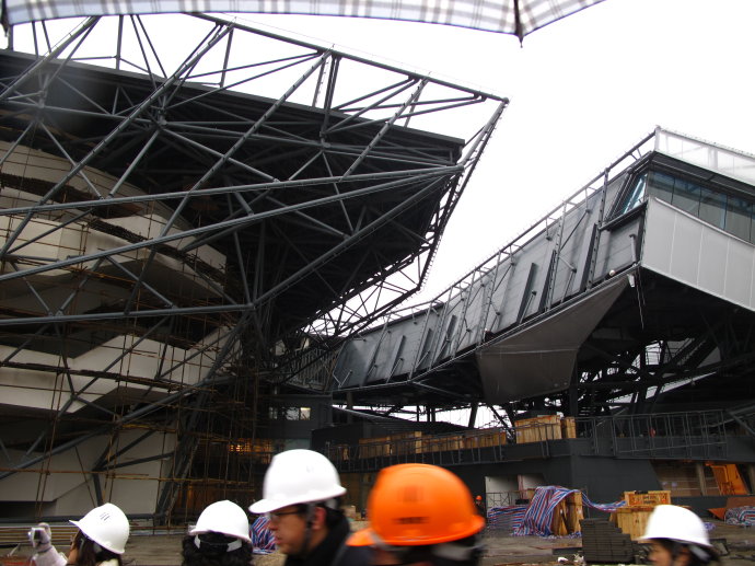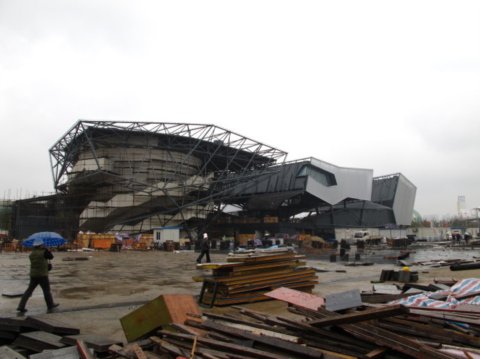 德國館則一反大家對德國建筑精致理性的印象,一組在空中的建筑任意扭動交錯,算不上新意,卻夠極致。似乎證明給大家,“誰說德國人沒有感性的腦袋”?現(xiàn)在建筑的外立面尚未包裹完整,密密匝匝的鋼結(jié)構(gòu)暴露了隱藏在純凈外觀后的秘密,一個小型建筑用了“大炮打蒼蠅”手段,可能正是一個“極致設(shè)計”應(yīng)有的代價吧。
