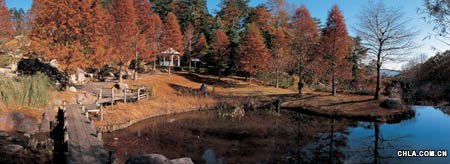 位于靜岡縣田方郡修善寺町,面積40 hm2。此作品設計的是主題公園景觀。中國的主題公園發展起步較晚,而主題公園的環境景觀更是沒有一個可以參考的范例。戶田先生在作品中,根據不同主題的要求,按時間和空間,把“創造”和“使用”兩種完全不同的方式有機地結合起來。充分利用光、風、水、土等自然要素,反映不同文化背景、風土人情,從景觀設計的角度,對主題公園進行統一合理的規劃(圖1)。