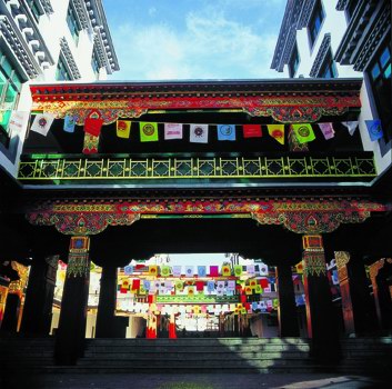 從僧侶手中的經筒到圍著瑪尼堆轉動的人群,再到老百姓轉莊稼地的習俗,旋轉輪回的情結在藏民族的生活中處處體現,其中最具代表性的符號就是曼陀羅。本設計以曼陀羅作為空間布局、景觀布局、建筑布局的基本形式,大到廣場界面,小到噴水池和疊泉,曼陀羅的形象反復出現,將約300米的商業街連為一體,并強化了藏民族的地方精神。