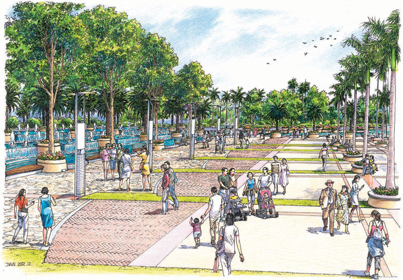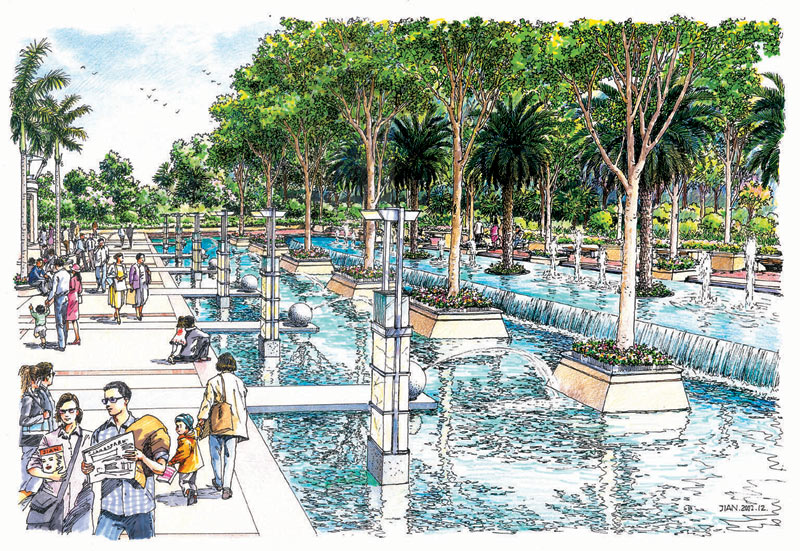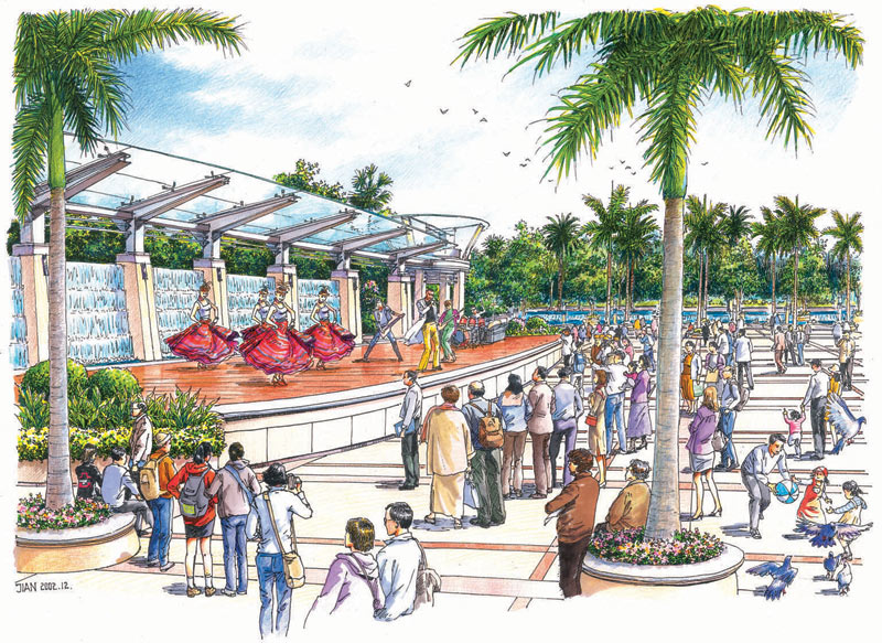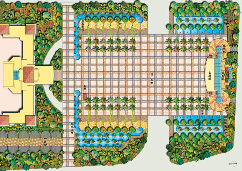 在設計中,以植物分隔出一個圍合的廣場空間,合理地組織車流、人流,將車流組織在大圍合的外圍;廣場以自由式的小徑為主,隨意蜿蜒青山綠水中,閑時拾步,身心俱靜;大大小小的綠洲緊密相連,使得人們可以安全、隨意地享受自然。廣場親水性強,池水較淺,人們在欣賞水景的同時,還可親身接觸;廣場綠化充分運用美景原則,采用適合廣東地區的樹種,做到點、線、面相結合,大、中、小相結合,集中與分散相結合,重點與一般相結合,以形成一個完整的系統。廣場照明設施的功能不限于夜間照明,還注重燈具白天的景觀效果,做到統一、連續、整齊,讓整個廣場洋溢在明麗、歡快、祥和的氣氛中。