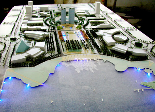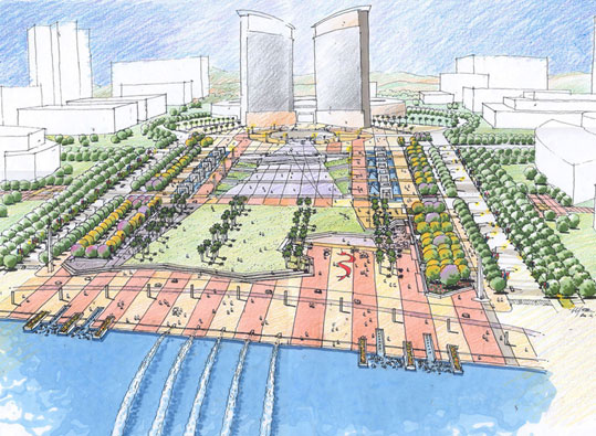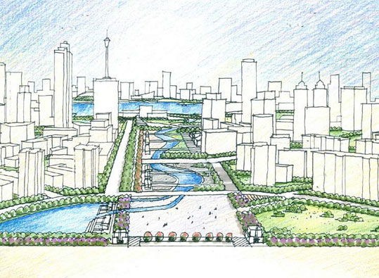 在視覺上,以北端的市政大樓至南端的省政府大樓,用廣場,水體至大片綠地的自然,滲透和過渡,用強有力的線性組織景觀,概括為“一軸多場”,一條景觀主軸貫穿整過區域,并由此產生,下沉廣場,跌落式水體廣場,跌落式表演廣場,濱海廣場,科技史公園等系列景觀節點,立體的景觀結構使新城區景觀,成為新城區除中心水面,環城河道之外又一景觀亮點。