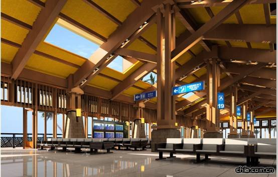 在航站樓的中心地帶,建筑師還特地搭建了充滿海南氣息的景觀,形成別具一格的花園式候機區,整個花園風景優美,優雅的設計為旅客提供了休閑的室外候機空間,這在國內航站樓的建設中還屬獨創。在裝飾細部上,航站樓內部精心布置了充滿海南民俗風情的擺設,如游弋著各種五彩繽紛熱帶魚的超大魚缸,裝著各種各樣可愛形態小鳥的鳥籠,溢滿清新海洋氣息的地磚和飾滿熱帶風情彩繪柱子以及到達廳里熱情洋溢的熱帶植物,并在室內適當垂釣綠色,花色植物,如炮仗花,三角梅等,充分體現熱帶海濱度假風情及三亞鄉土文化,使每位到港旅客感受到了濃厚的三亞濱海旅游城市的特色和氣息。三亞鳳凰機場航站樓內空間的整體裝修為以灰、黃、白三色為主的淺色調,設計方案以嚴謹詳實的熱帶環境模擬計算為設計依據,實現室內開敞空間,全天候無人工空調,完全采用自然通風采光,達到日間無人工照明的自然光環境,使整個候機花園成為國內環保,節能生態候機樓的典范。