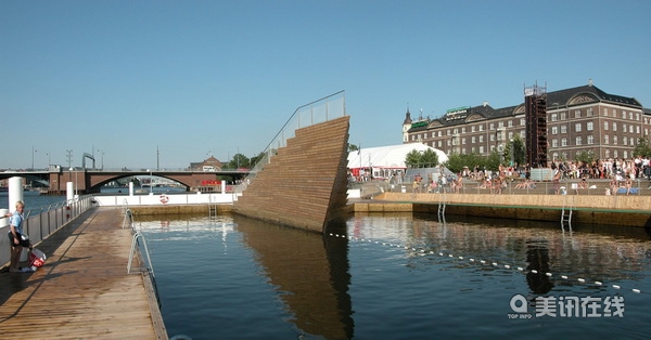 哥本哈根港口目前正處于從工業港口和交通樞紐功能向城市文化社交中心轉變的過程中,該港口游泳池(Harbour Bath)便是這項改造項目的重要組成部分。它位于哥本哈根南岸水面的港口公園的水里,整個區域以頭為材料,有三個分開的池,還有一個造型特殊的跳水臺。Harbour Bath并未簡單的模仿丹麥傳統的室內泳池設計,而是提供了一種集干船塢、碼頭、船跳板、攀巖壁、游樂場與浮橋為一身的都市港口景觀。作為一種梯級式景觀,Harbour Bath巧妙的掩藏了陸地與水面的界限,使得哥本哈根市民可以在城市中心就可以盡情的享受在海里游泳的暢快淋漓。