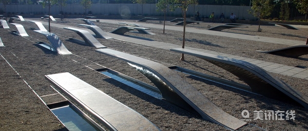 每一個紀念單元的模型,通過CNC制作成模,然后用不銹鋼鑄造而成,名字雕刻在懸臂的末端,懸臂下是一條流淌的小河,夜晚時它會會發出寂靜的光芒。場地上的砂石地讓人們可以聽見彼此的腳步聲,同時也讓種植的樹木不需要其他保護柵欄而自然生長,在將來它們會提供遮陰地,同時它們掉落的樹皮將見證著時間的流逝。
