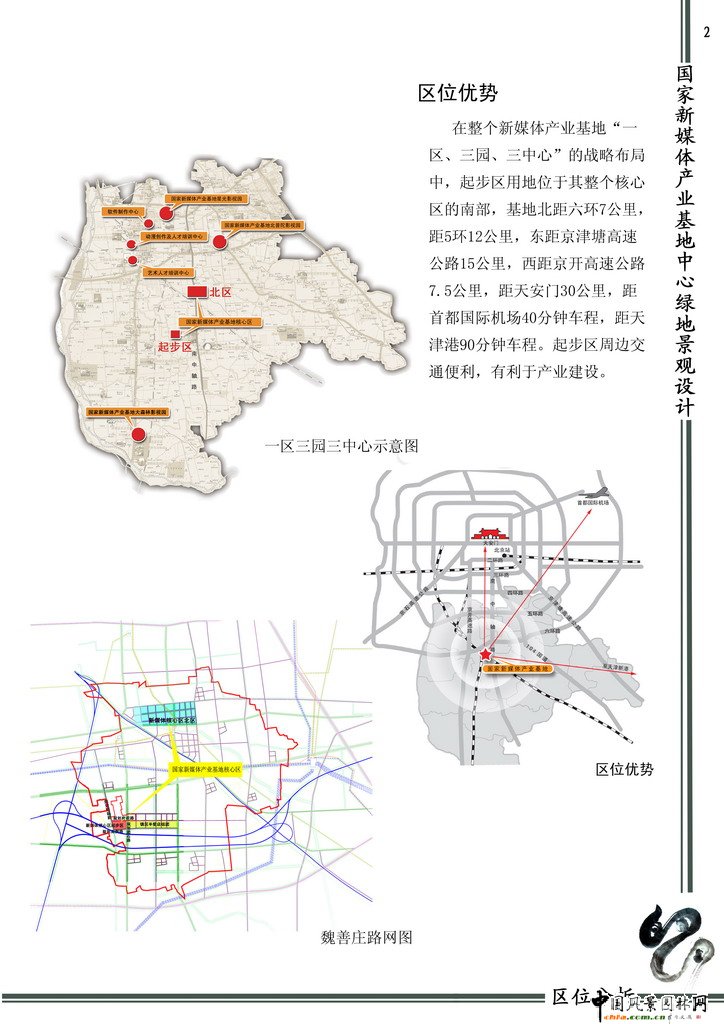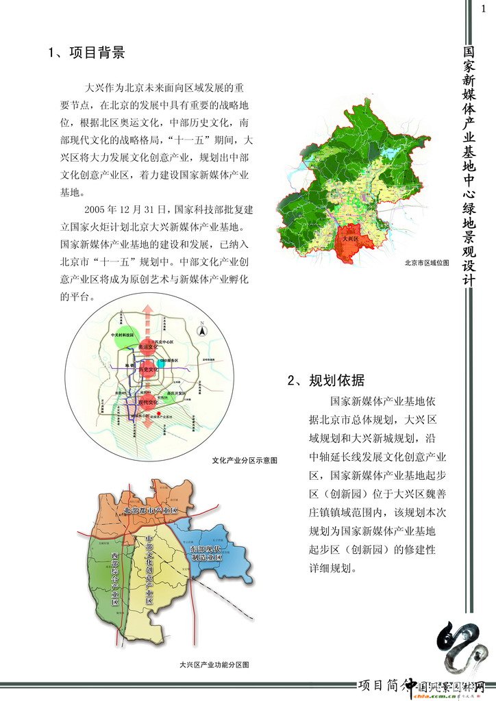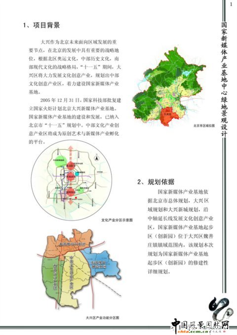 國家新媒體產業建設得到了國家科技部、北京市政府、大興區政府的大力支持,并且被寫入了北京市十一五規劃當中。新媒體產業基地占地面積大,作為大興區整個產業戰略布局的中央核心區,應該有自身產業特色的形象代表。中心綠地的建成,將為創新園區提供一個高雅、綠色、現代、時尚的娛樂休憩理想勝地。并且中心綠地地勢平坦,周邊植被豐厚,為工程建成提供了一個良好的平臺。
