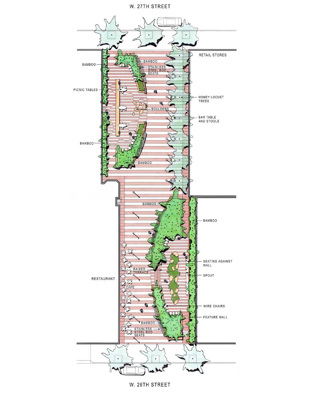 墻壁上爬滿卷曲著的植物,這樣的薄墻將空間劃分為幾個區域,有著不同的隱私度。用戶定制設計的不銹鋼家具比如條桌和可旋轉的凳子,和咖啡桌連接的長椅,給想坐下來休息的人們提供了多種的選擇性。100英尺長的波浪狀的金屬墻被涂抹上鮮亮的橙色,目的是為了吸引從Sixth Avenue而來的步行者和車輛。墻上橢圓形的孔和從中伸出來的弱化了風景和建筑之間的距離。其中一個橢圓的不銹鋼框架排水道使植物生存的環境更有保障性。