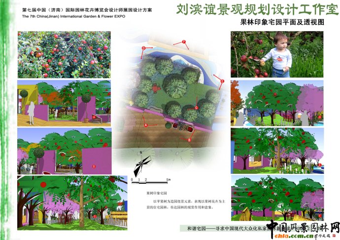 4)果樹宅園。以蘋果樹為造園組景元素,表現以果樹花卉為主景的住宅園林,傳達園林的觀賞作用和意象。
