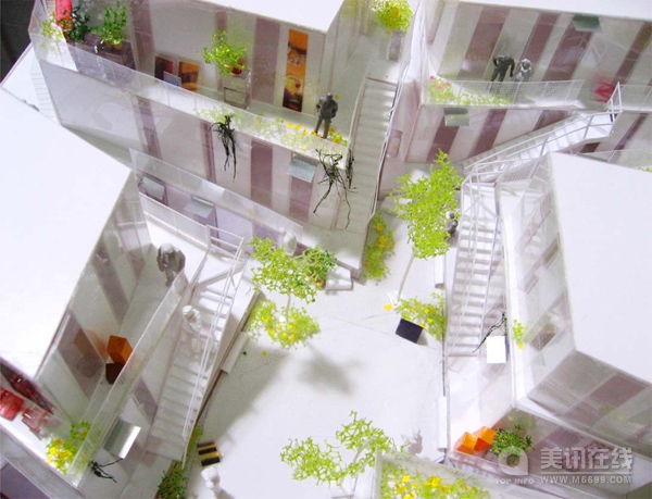 這一商業(yè)街位于東京代官山商業(yè)區(qū),其建筑都是上下兩層的,每家店的面積大約為150平方米。這里所有店面的規(guī)模、裝修風(fēng)格、周邊設(shè)計(jì)都大致相同。其陽(yáng)臺(tái)的設(shè)計(jì)如同住宅一樣。按照建筑條例,在狹窄的空間只能修建一些小型的建筑。而平田晃久卻將這一商業(yè)街設(shè)計(jì)的如同小山的規(guī)模一樣。