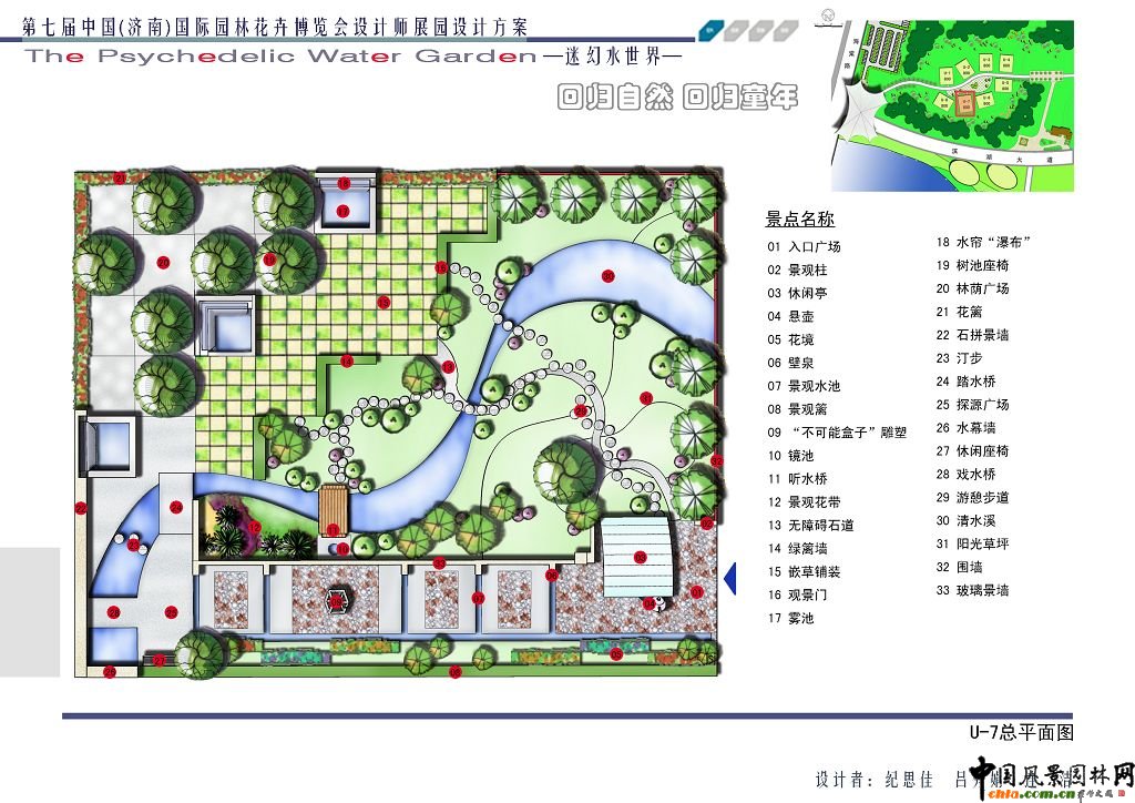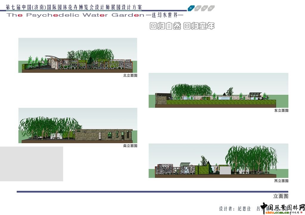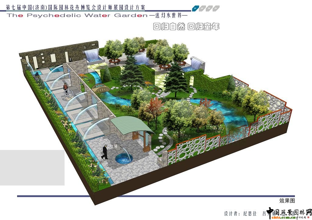 中國風景園林網 2009年2月,第七屆園博會組委會通過中國風景園林網向全國公開征集園博園國際展區設計師園8個展園的設計方案,截止到2月底,共收到49份設計方案。經過嚴格評選,共評優勝獎8名、優秀獎8名和鼓勵獎10名。本文重點介紹優勝獎“迷幻水世界”設計方案。